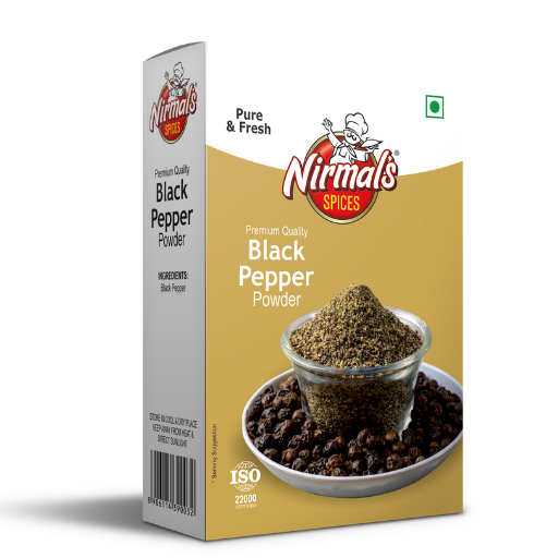 Add bold flavor and aroma to your dishes with Nirmal’s Premium Black Pepper Powder — a pure, finely ground spice made from the best-quality black peppercorns, perfect for seasoning, curries, soups, and salads.