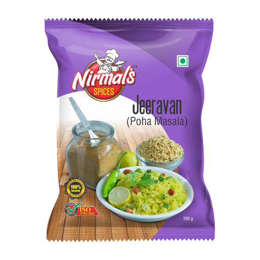 Add the authentic Indori flavor to your breakfast with Nirmal’s Premium Jeeravan (Poha Masala) Pouch — a perfectly balanced mix of aromatic Indian spices that gives your poha, upma, and chaats a tangy, spicy, and mouth-watering taste.